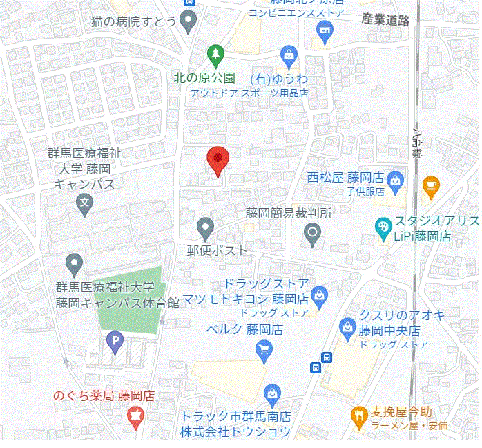 群馬医療福祉大学(旧・藤岡女子高校)のすぐ近く(東側)で、駅から歩いて10分ほどのところです。