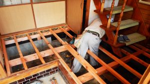 お見積りの内容は、床板のみではなく、大引、根太、束をすべて交換し、床も下地板を敷いた上にフローリング材を敷くこととしました。